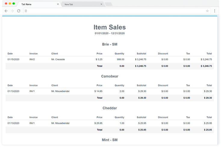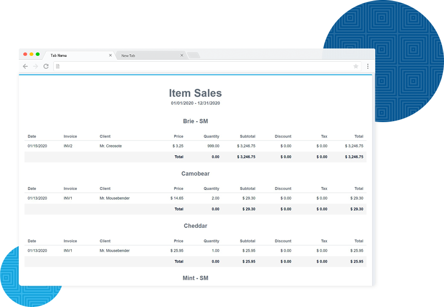 Easily track your profit and loss, sales by client, item sales, payments, taxes owed, and more!