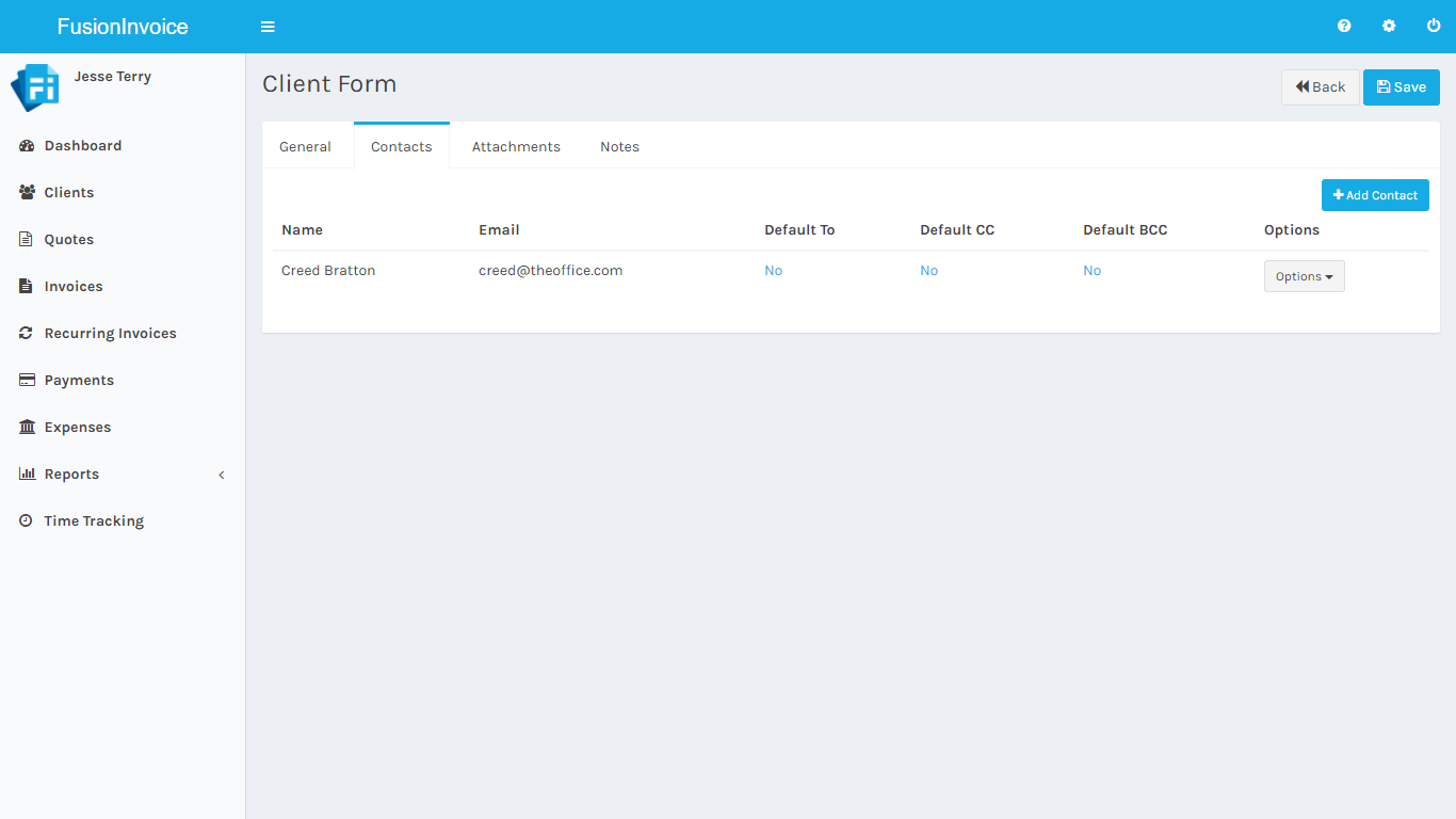 Once the contact has been added, you can set them as a default to, cc or bcc recipient for outgoing quotes and invoices for the client the contact was added to.