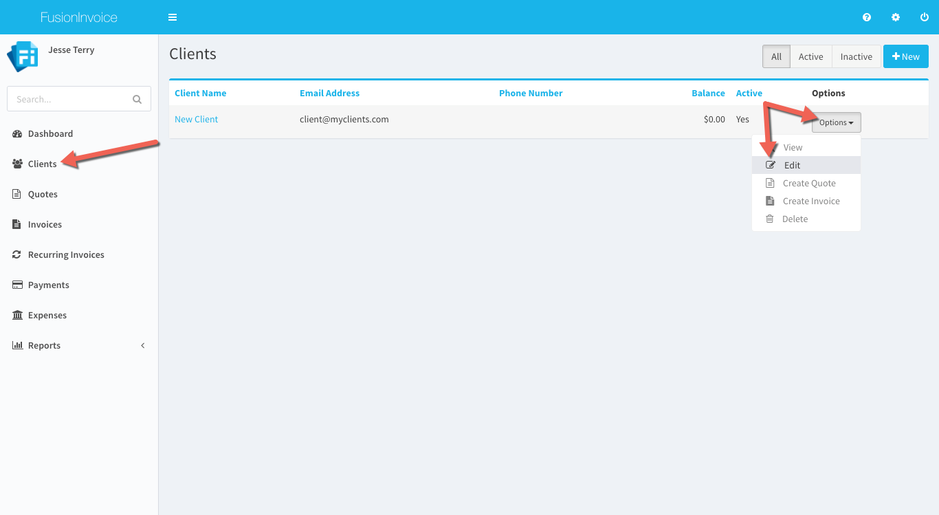 To do so, edit the client record by clicking the Clients menu item, and then pressing the Options button on the client to edit and choosing Edit.