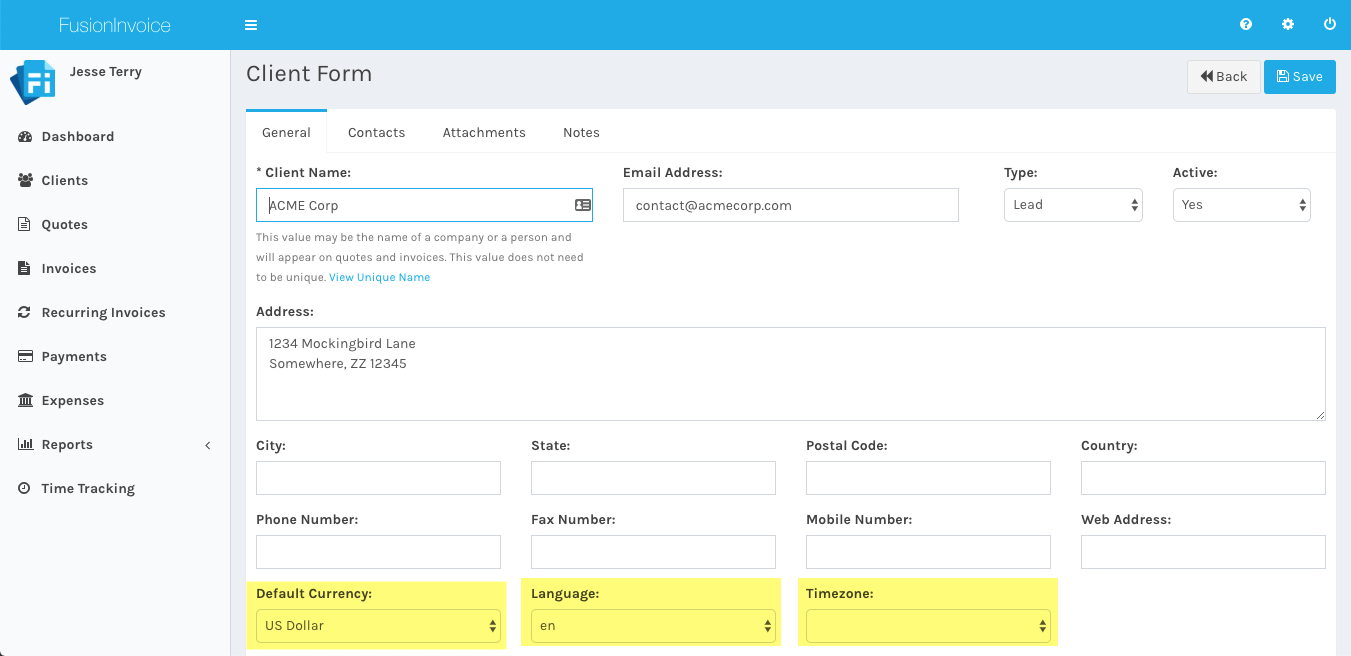 The currency, language and timezone can be adjusted on the Client Form screen when editing an existing client or adding a new client. When the timezone is set, the client's local time will display on the View Client screen.