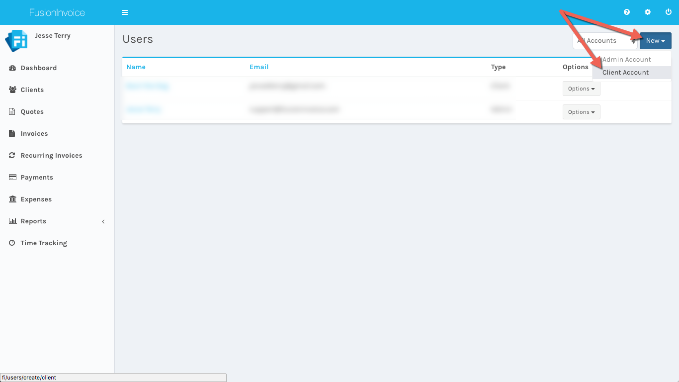 To create a client user account, click the New button and then choose Client Account.