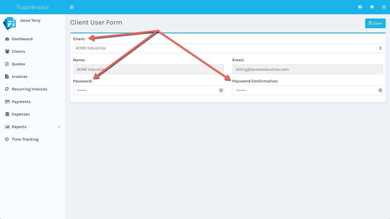 Select the name of the client to create the account for from the dropdown. The name and email address fields will fill in automatically. Enter and confirm the account password and press the Save button.