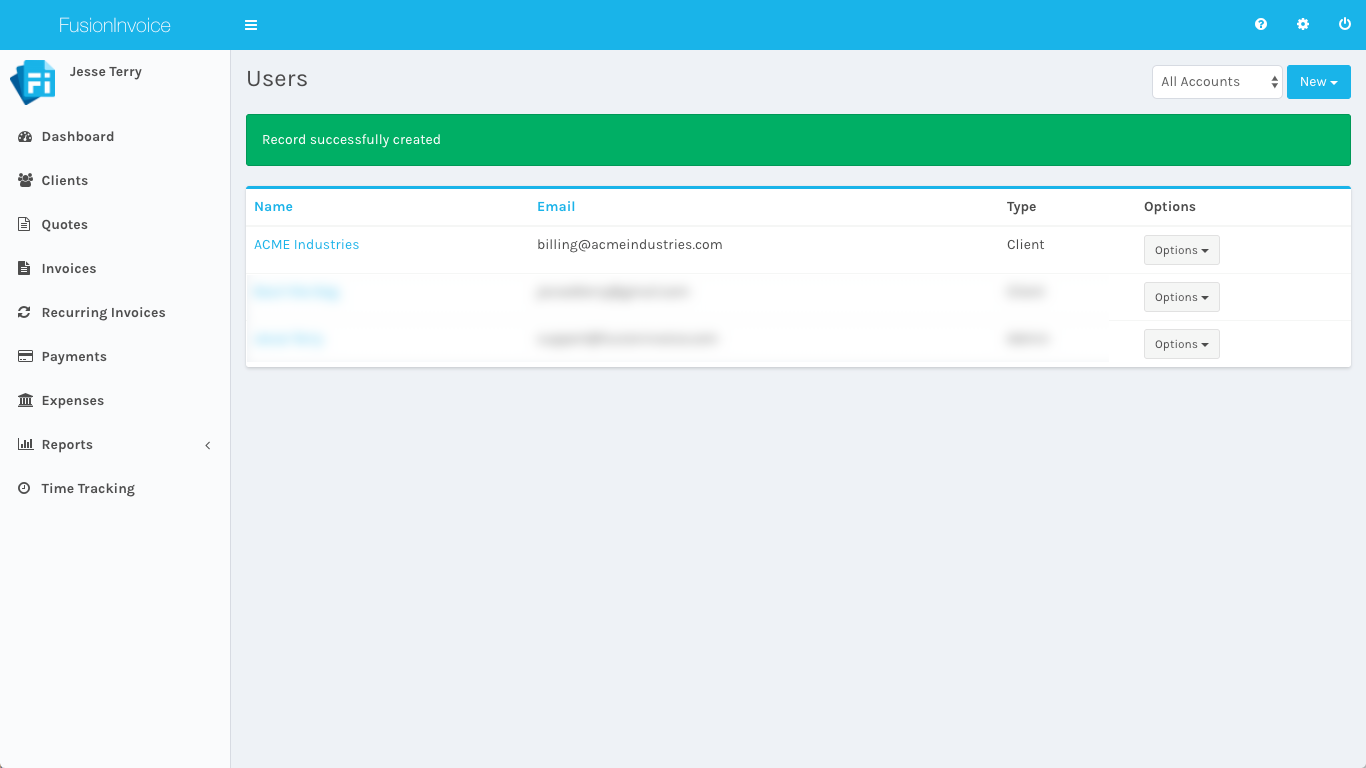 Once the account has been created, it will be listed as a Client account. Client accounts log in using the same URL as admin accounts, but they will be logged into the Client Center, which provides limited access to just their invoices, quotes and payments.
