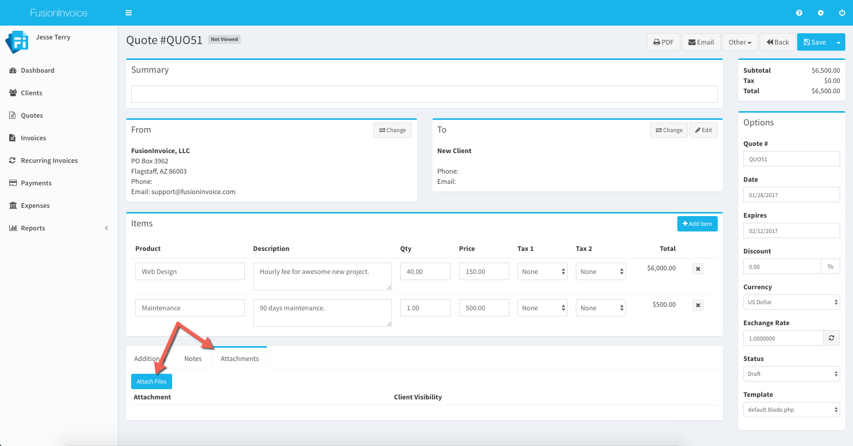 * Note that attachments uploaded to a quote do not "attach" themselves to the quote PDF output. Quote attachments are intended to provide an easy way to deliver digital assets related to a quote to your clients (or just to store related files for your own purposes).
