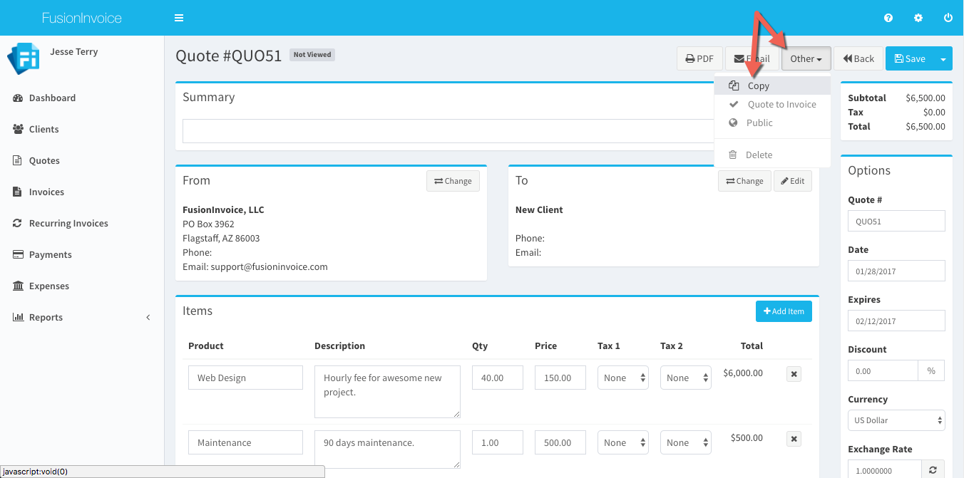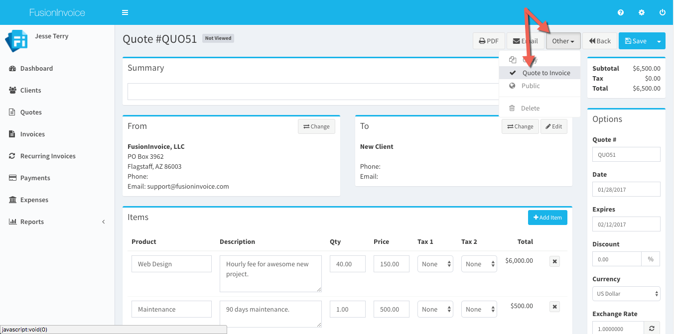 Once a client has accepted your quote, you can convert it to an invoice on the Quote Edit screen by clicking the Options button and choosing Quote to Invoice.