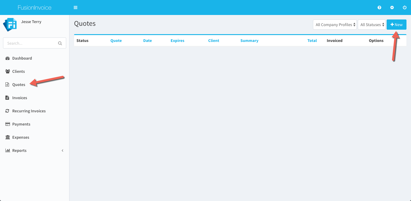 • Status - The current status of the quote. Once a quote has been emailed, the status will automatically update itself to Sent. If a client has accepted or rejected a quote from the public quote link, it will update itself to the appropriate status.
