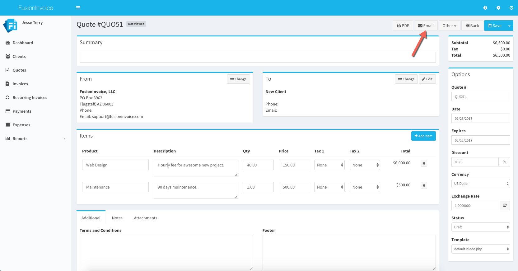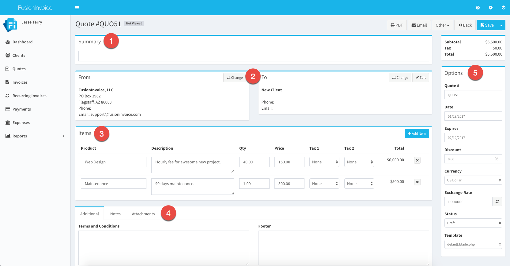 The Quote Edit screen is where you'll add line items as well as define further properties and options for your quote.