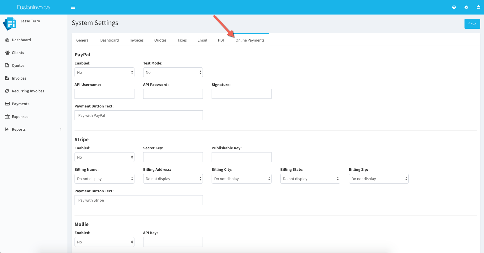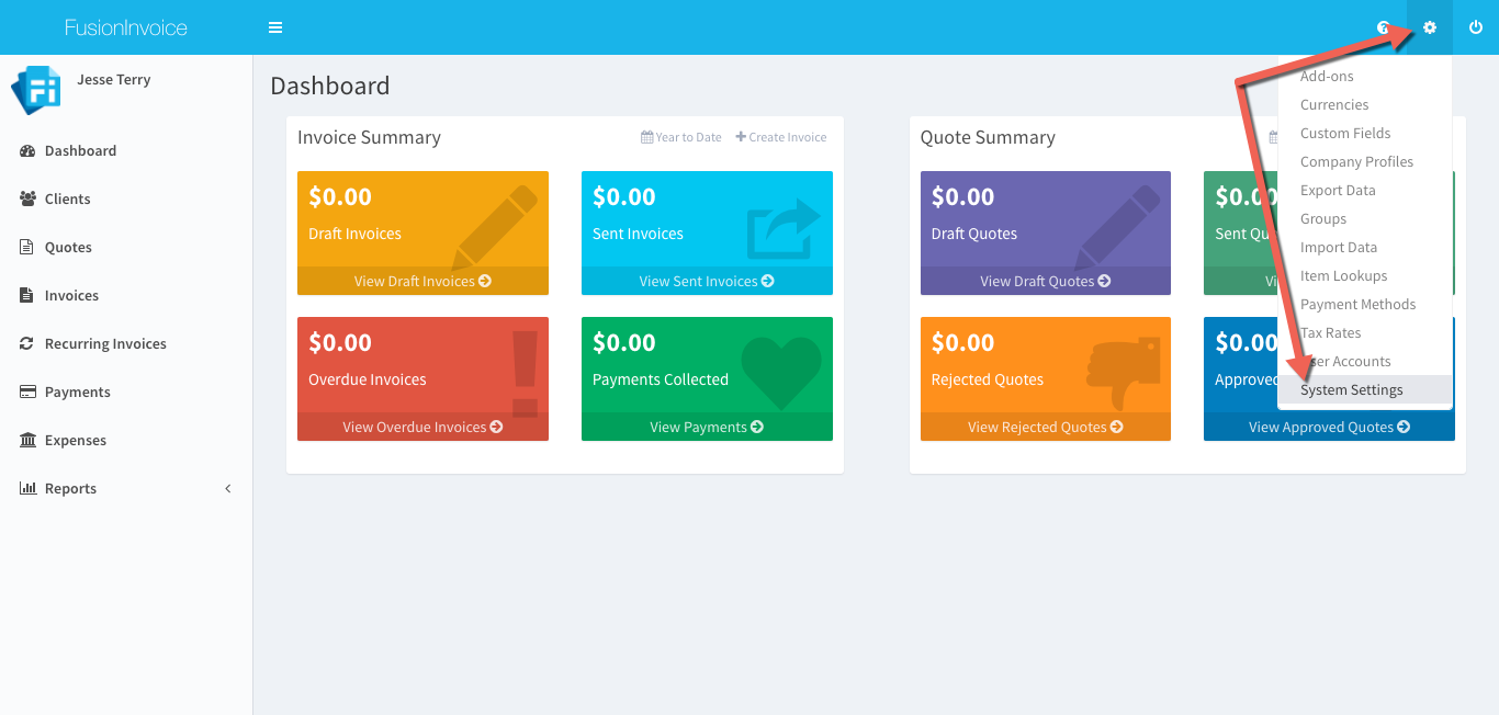 To configure FusionInvoice for online payments, click the System icon and select System Settings.
