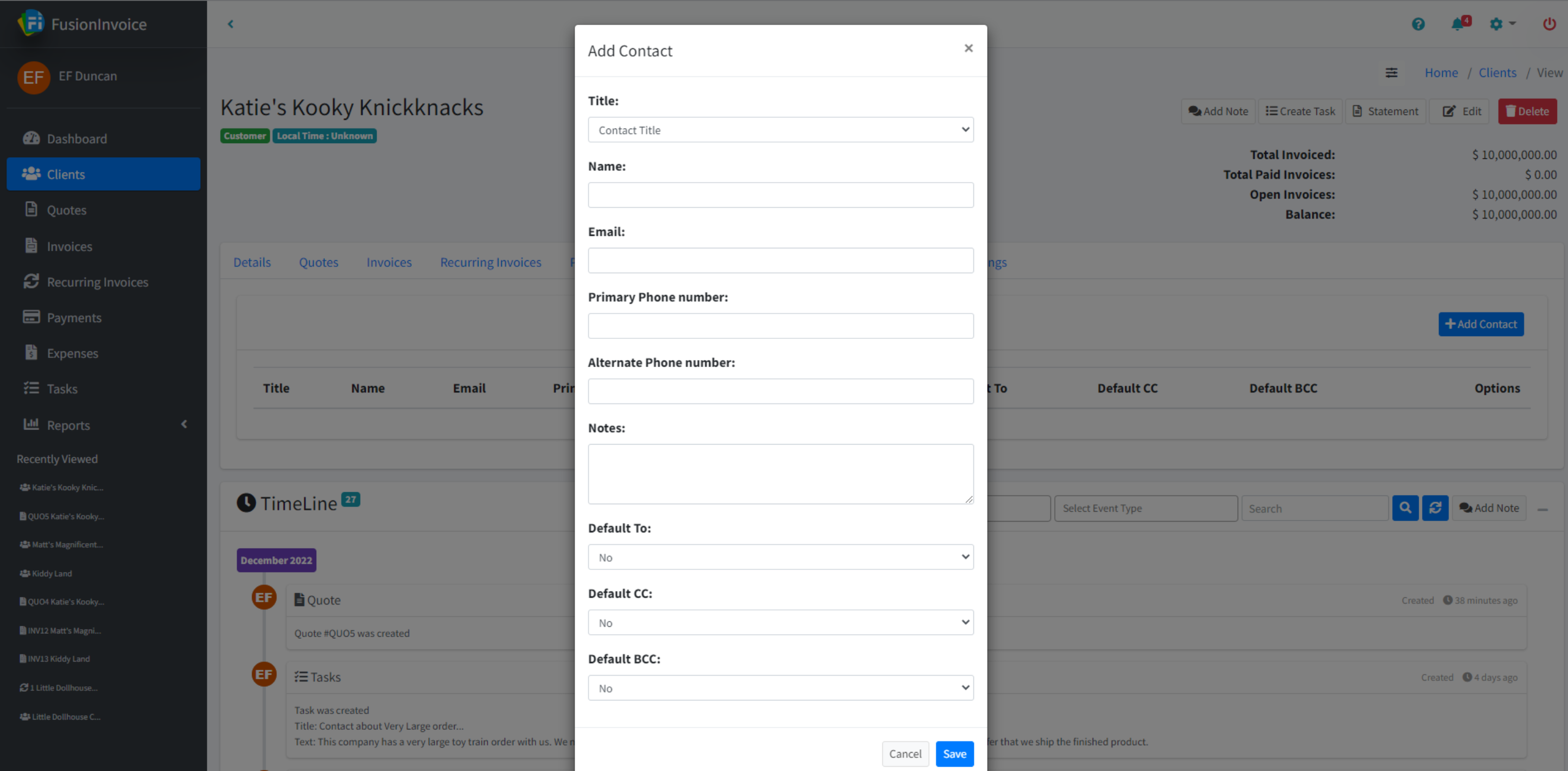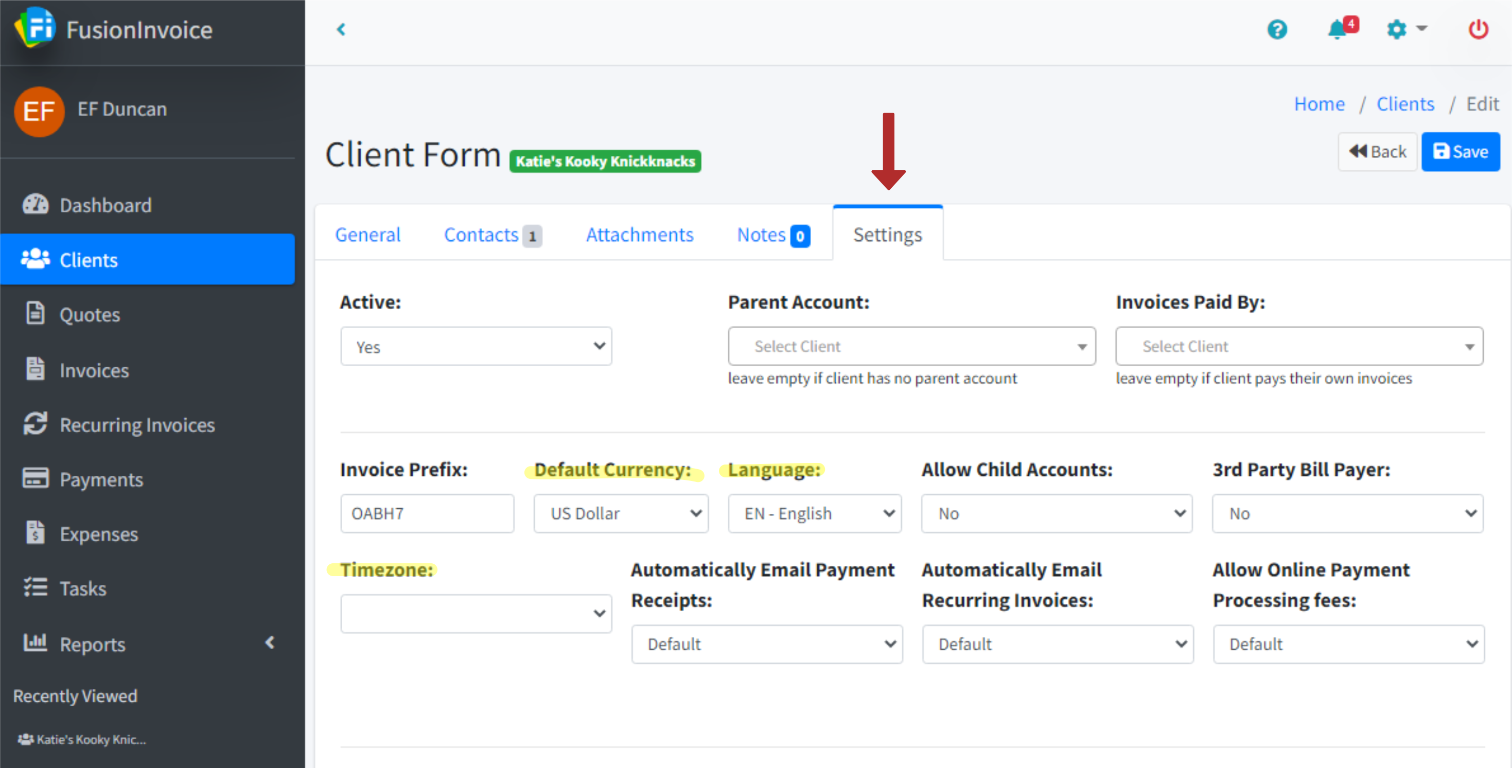 The currency, language and timezone can be adjusted on the Client Form screen when editing an existing client or adding a new client. When the timezone is set, the client's local time will display on the View Client screen.