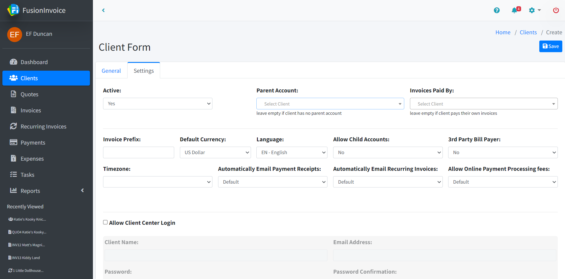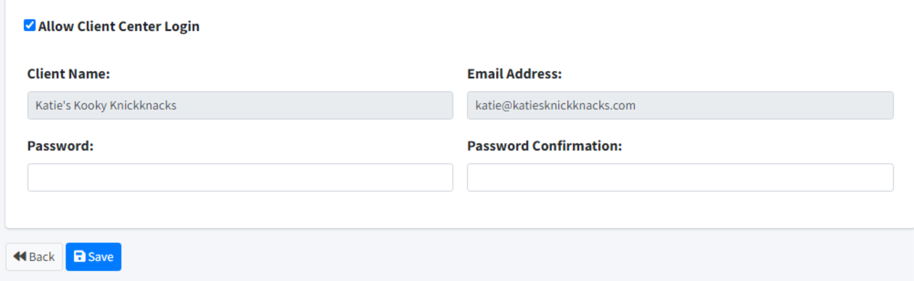 Check the box 'Allow Client Center Login' to enable the login creation. Create a password for the client. This will be the password they use to login. When finished, press Save on the account. You will need to provide the client with their login information.