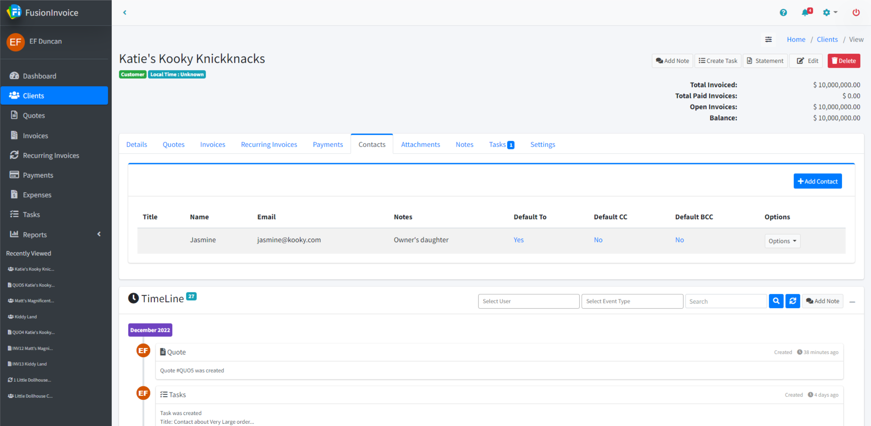Sometimes there may be multiple phone numbers and emails for various people within a company on a single client record. You can add them as contacts on the client record.