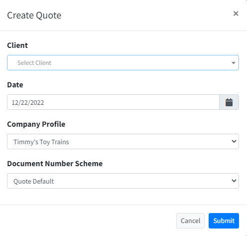 The Create Quote screen will prompt you for the Client Name, Quote Date, Company Profile, and Document Number Scheme.