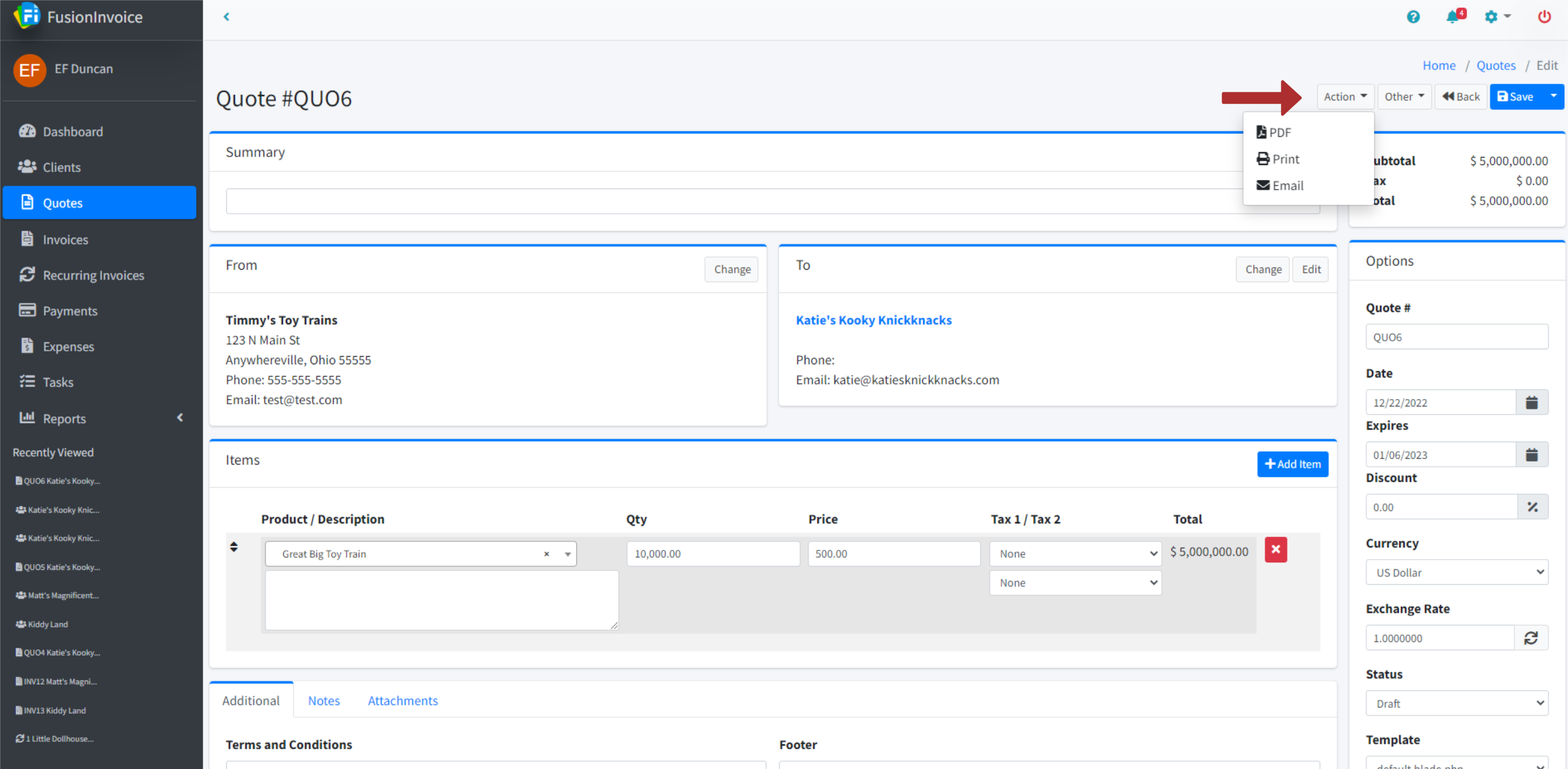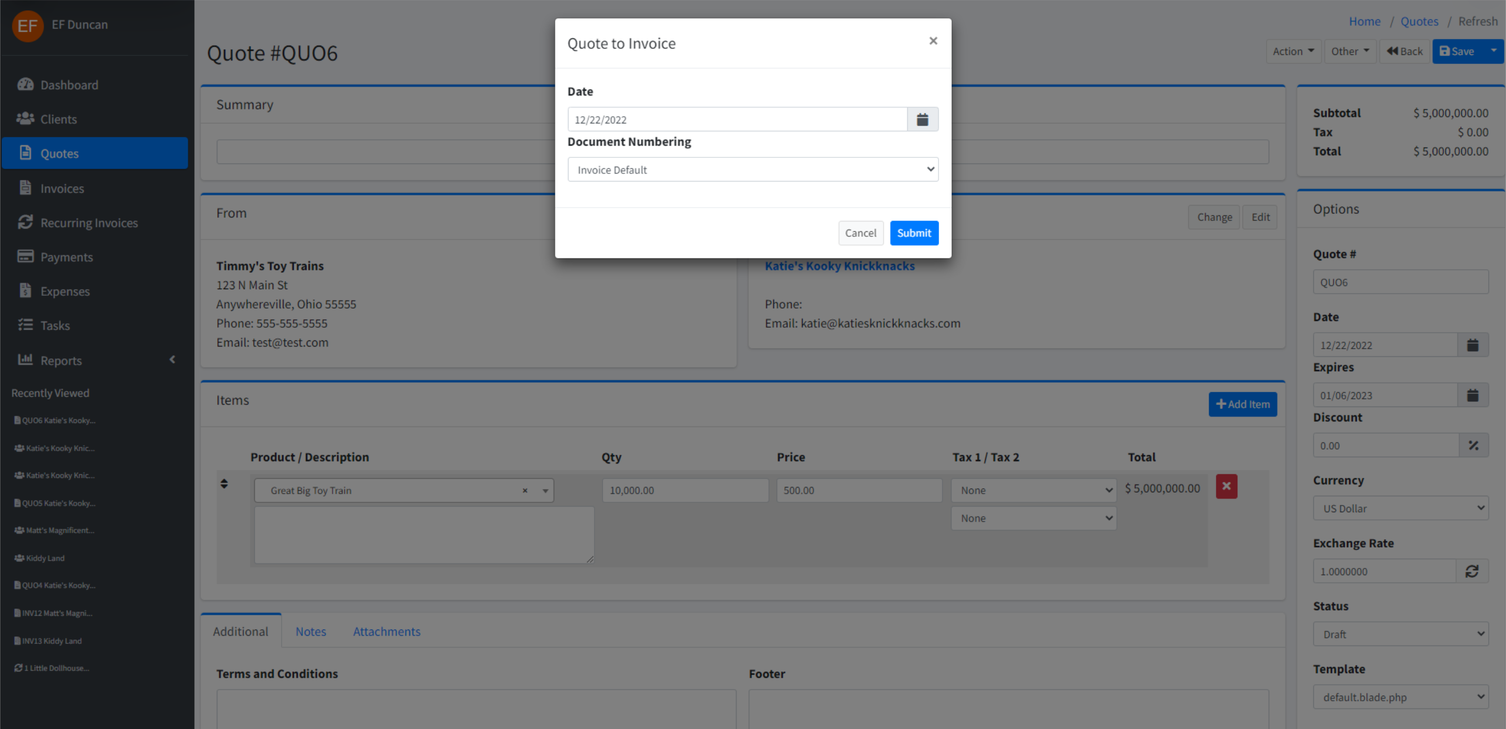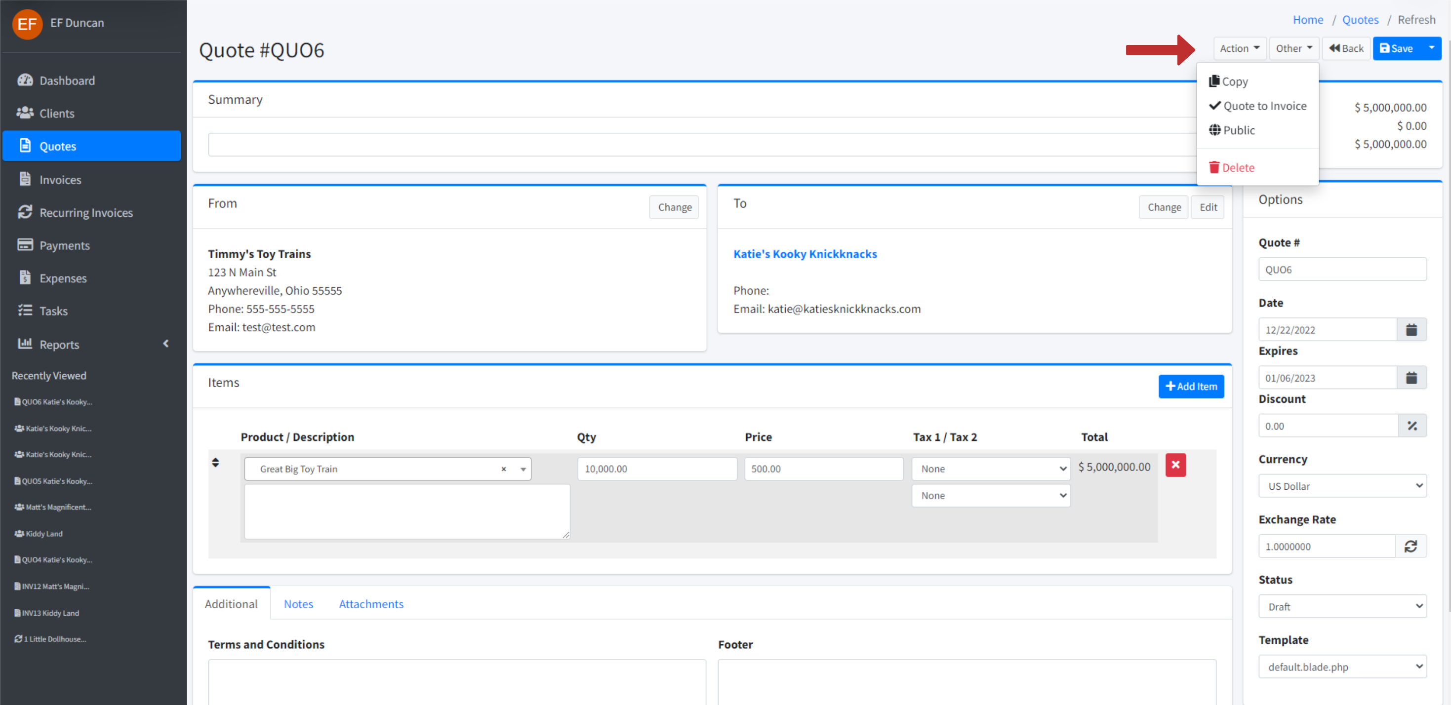 Once a client has accepted your quote, you can convert it to an invoice on the Quote Edit screen by clicking the Options button and choosing Quote to Invoice.