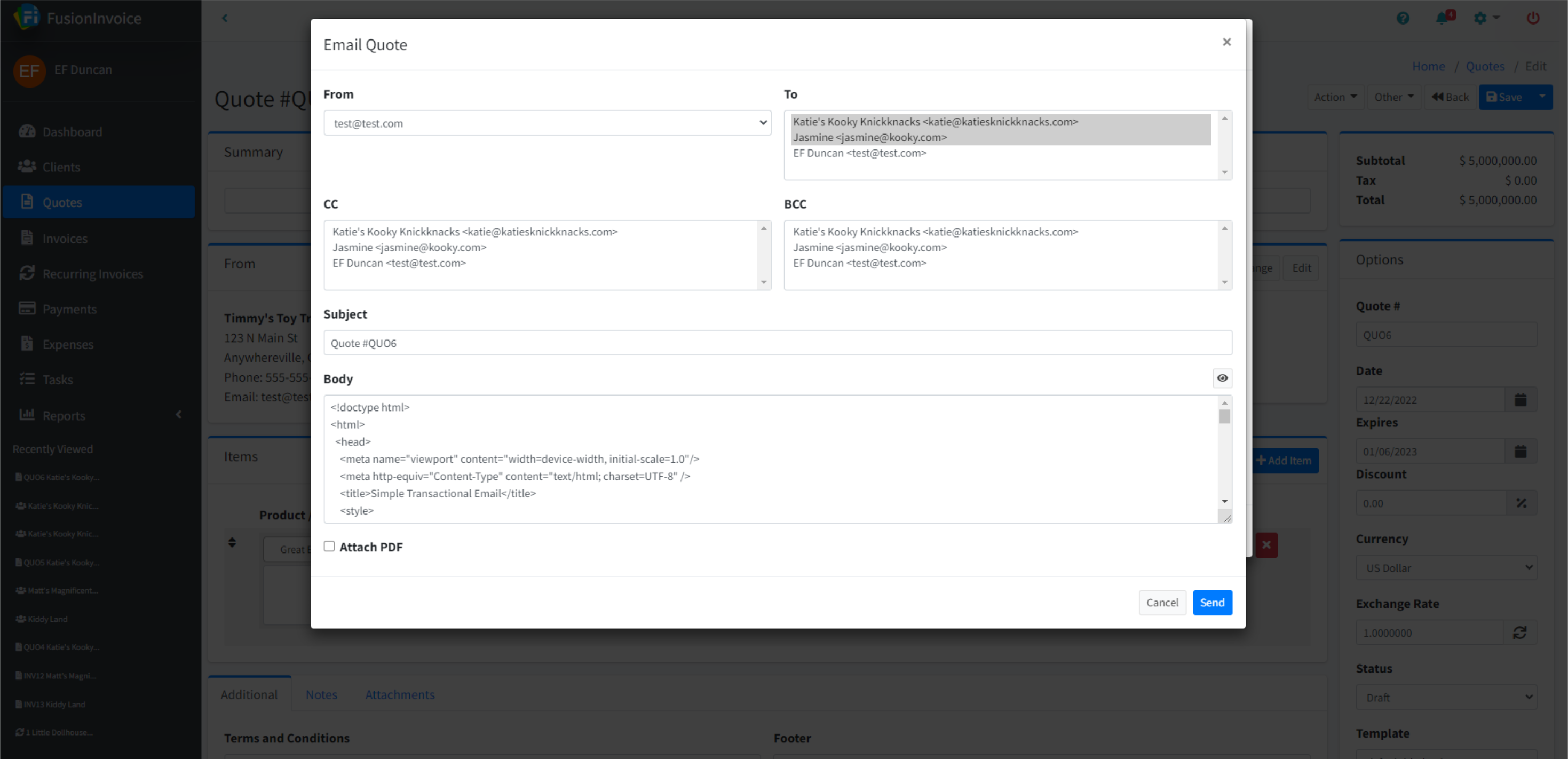 The Email Quote screen allows you to add additional recipients, change the subject and/or body, if necessary.
