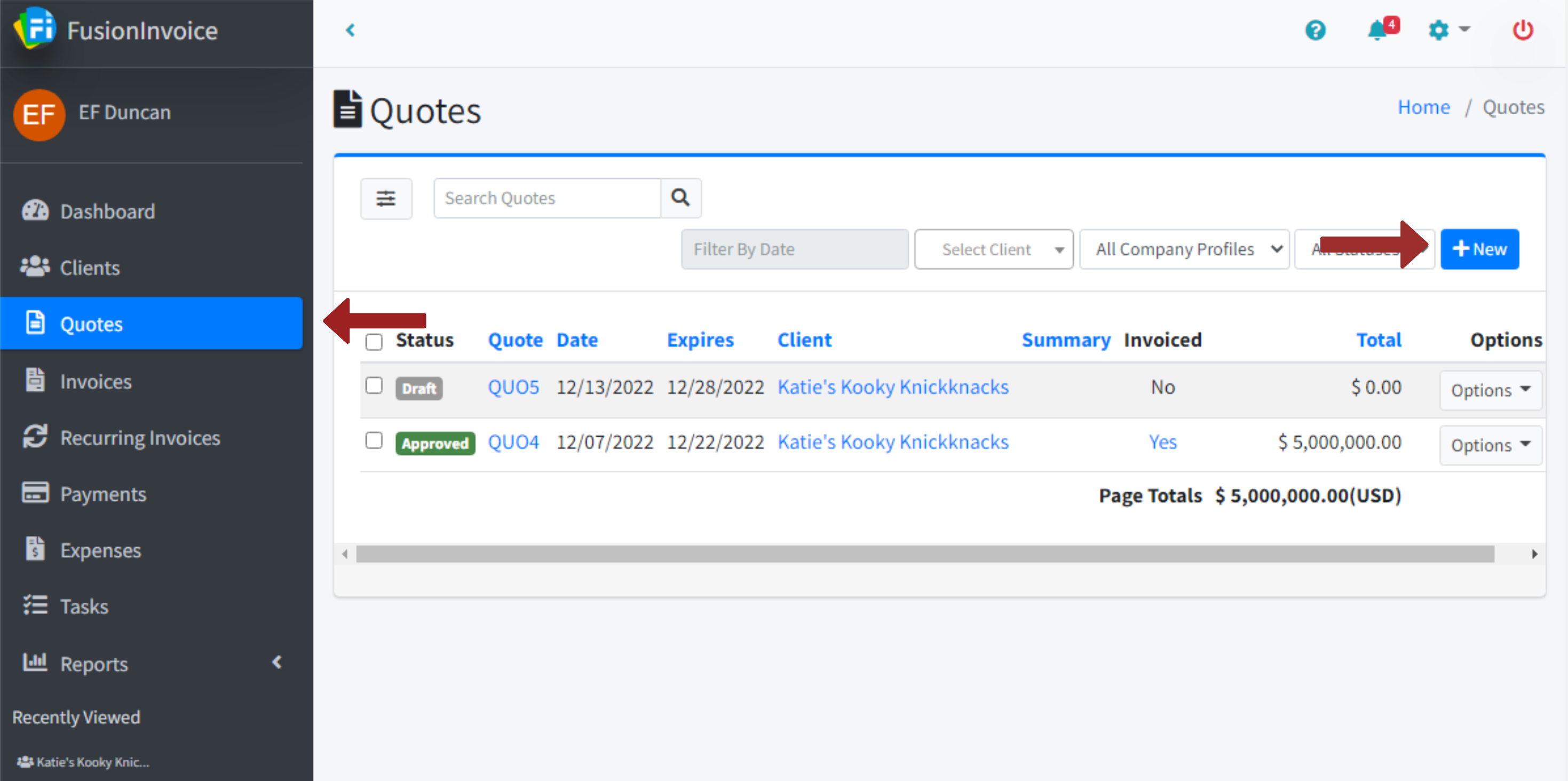 • Status - The current status of the quote. Once a quote has been emailed, the status will automatically update itself to Sent. If a client has accepted or rejected a quote from the public quote link, it will update itself to the appropriate status.