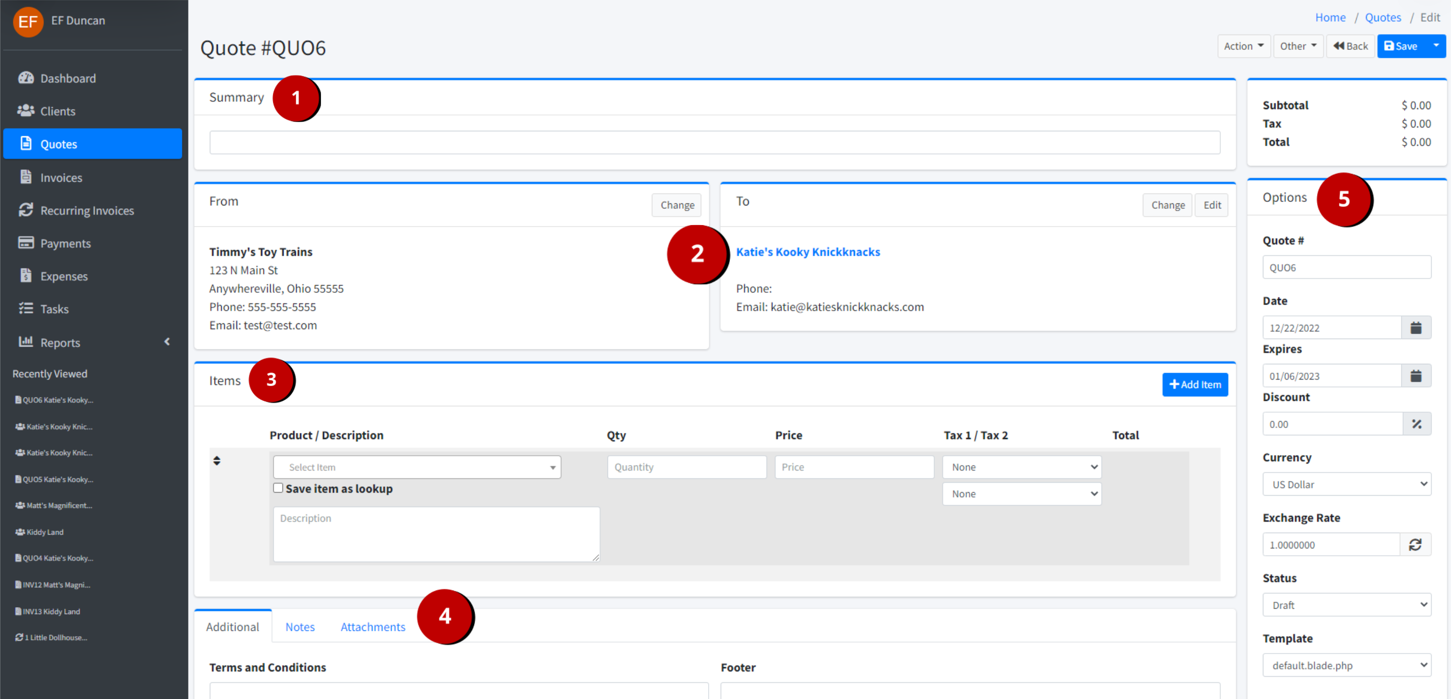 The Quote Edit screen is where you'll add line items as well as define further properties and options for your quote.