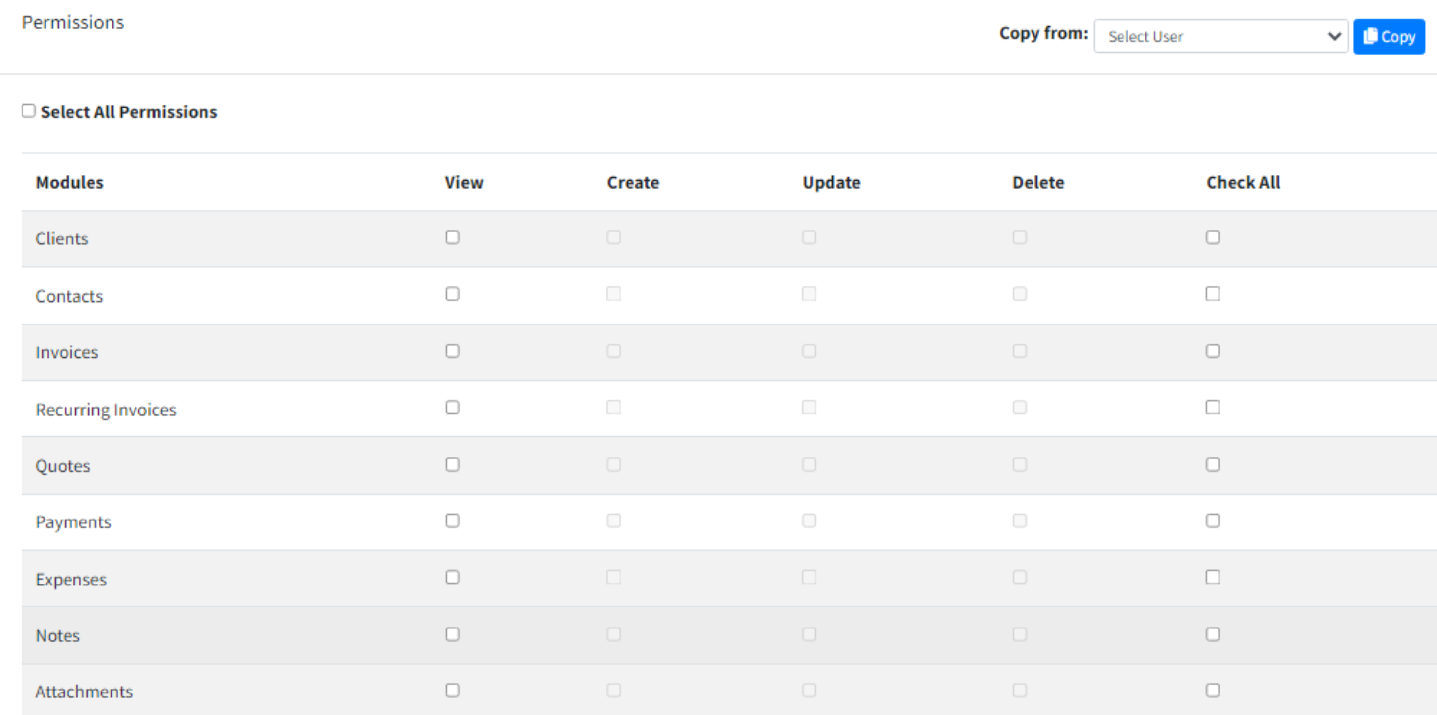 • Privileges can be copied from an existing standard user by using the dropdown at the top-right of the permissions section of the user edit page.