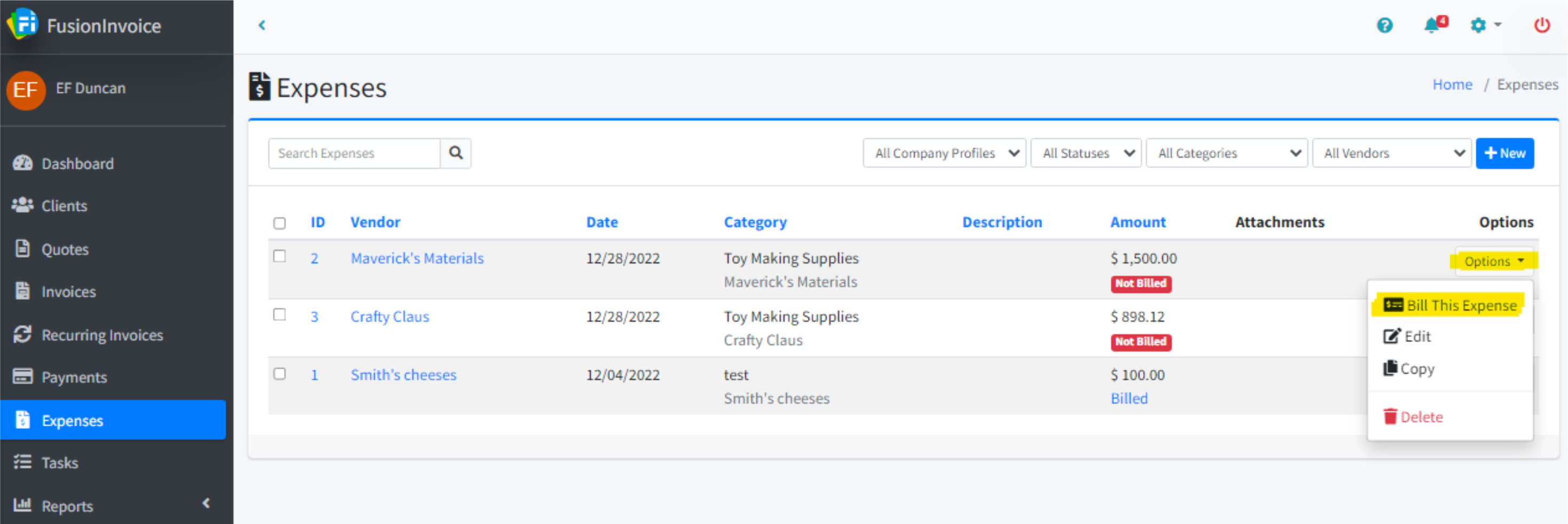 Click the Expenses menu item, press the Options button on the expense to bill, and select Bill This Expense.