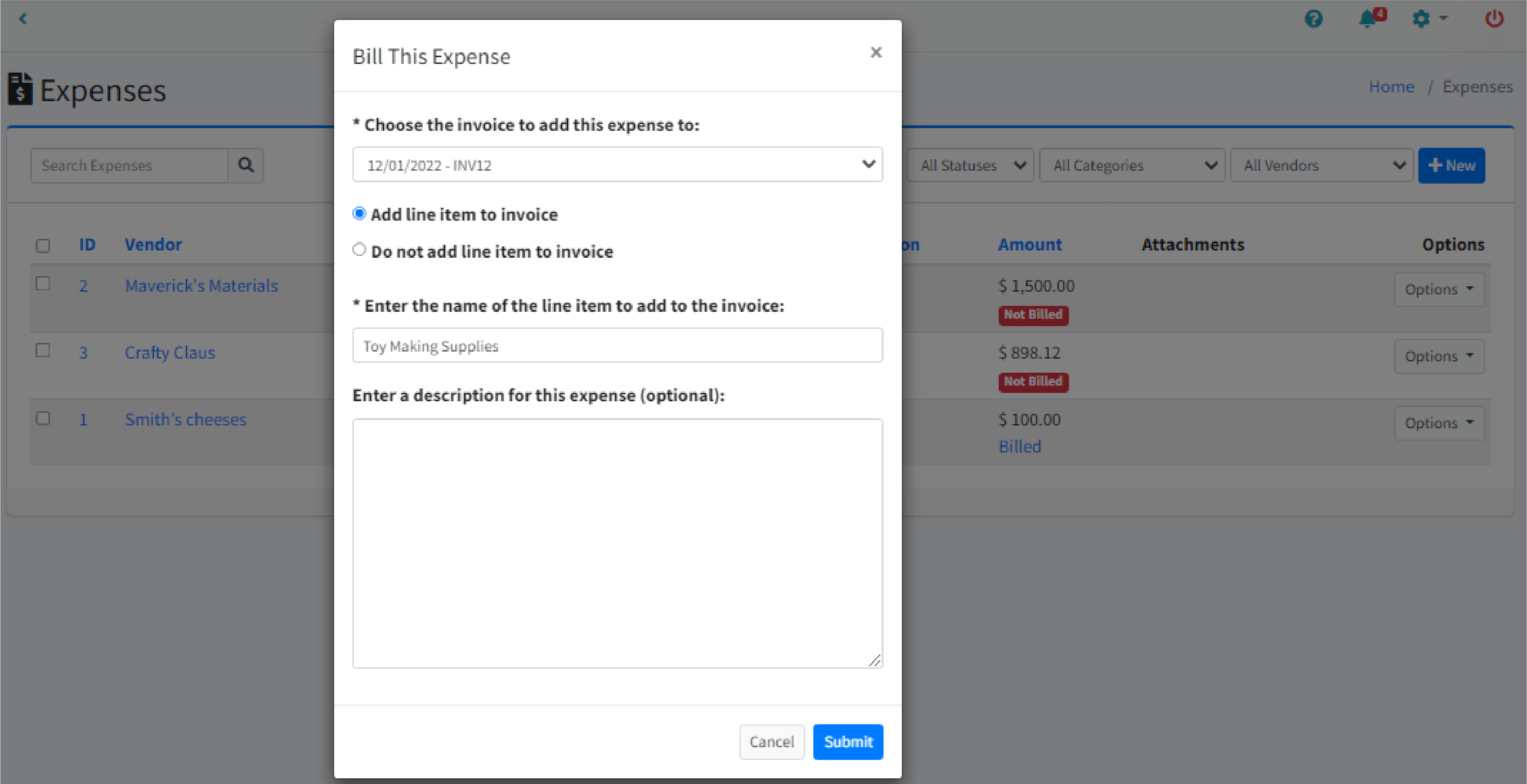 To add the expense to the invoice without adding a line item, choose Do not add line item to invoice.