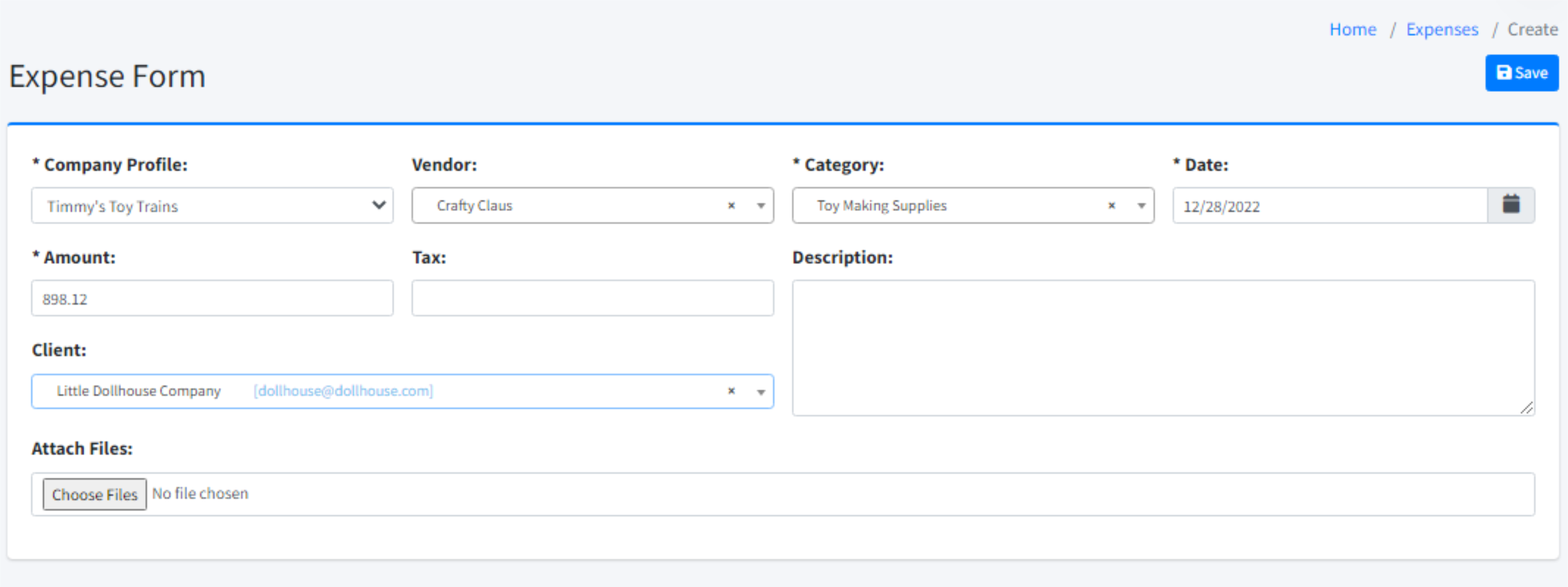 If this is a billable expense, enter the name of the client who will reimburse you. This will allow you to add this expense to an invoice after the expense is saved.