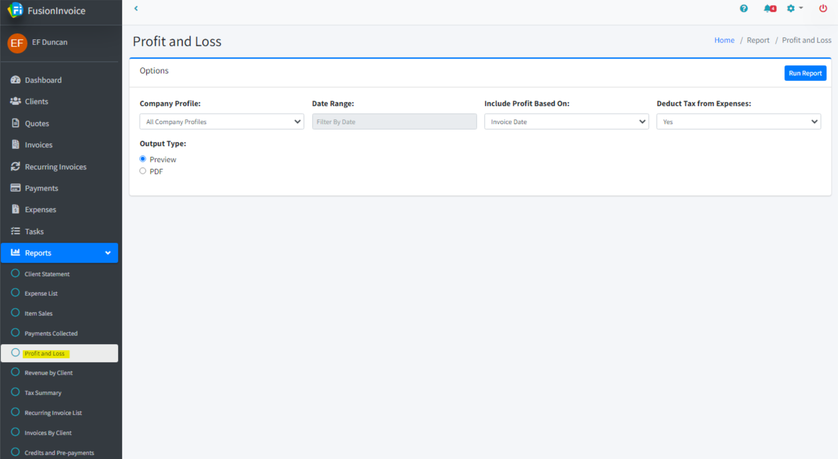 The Profit and Loss report can be run against all or one company profile for a specific date range.