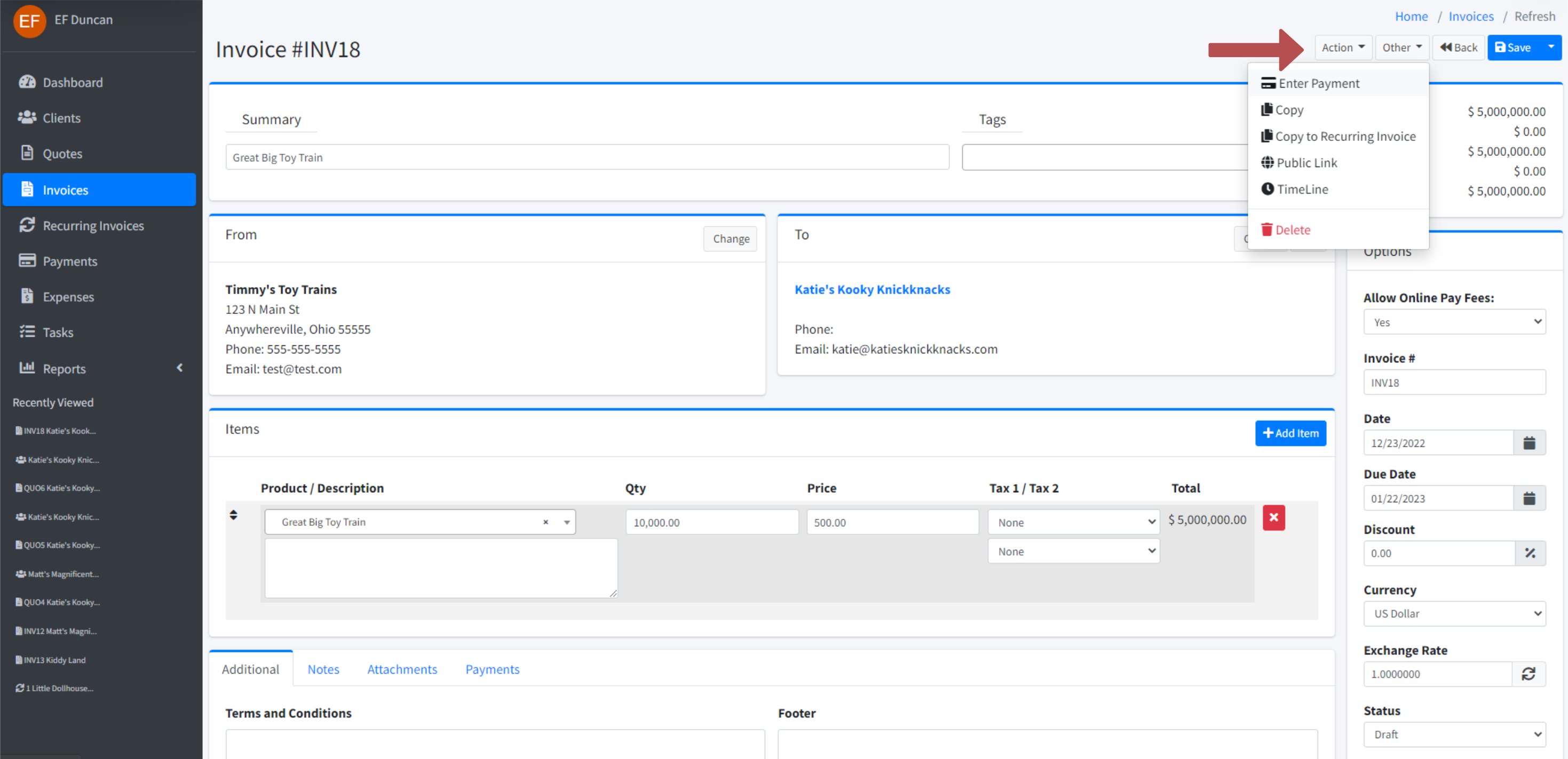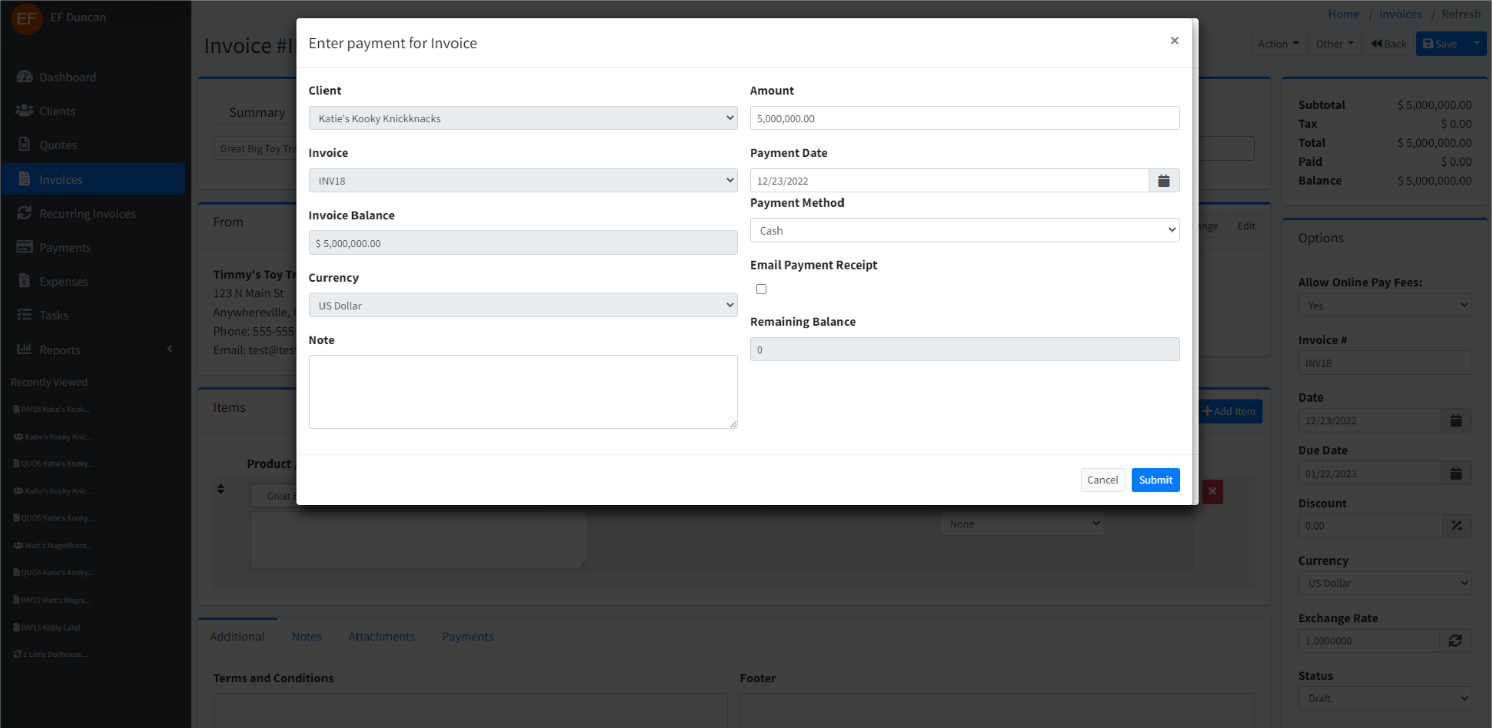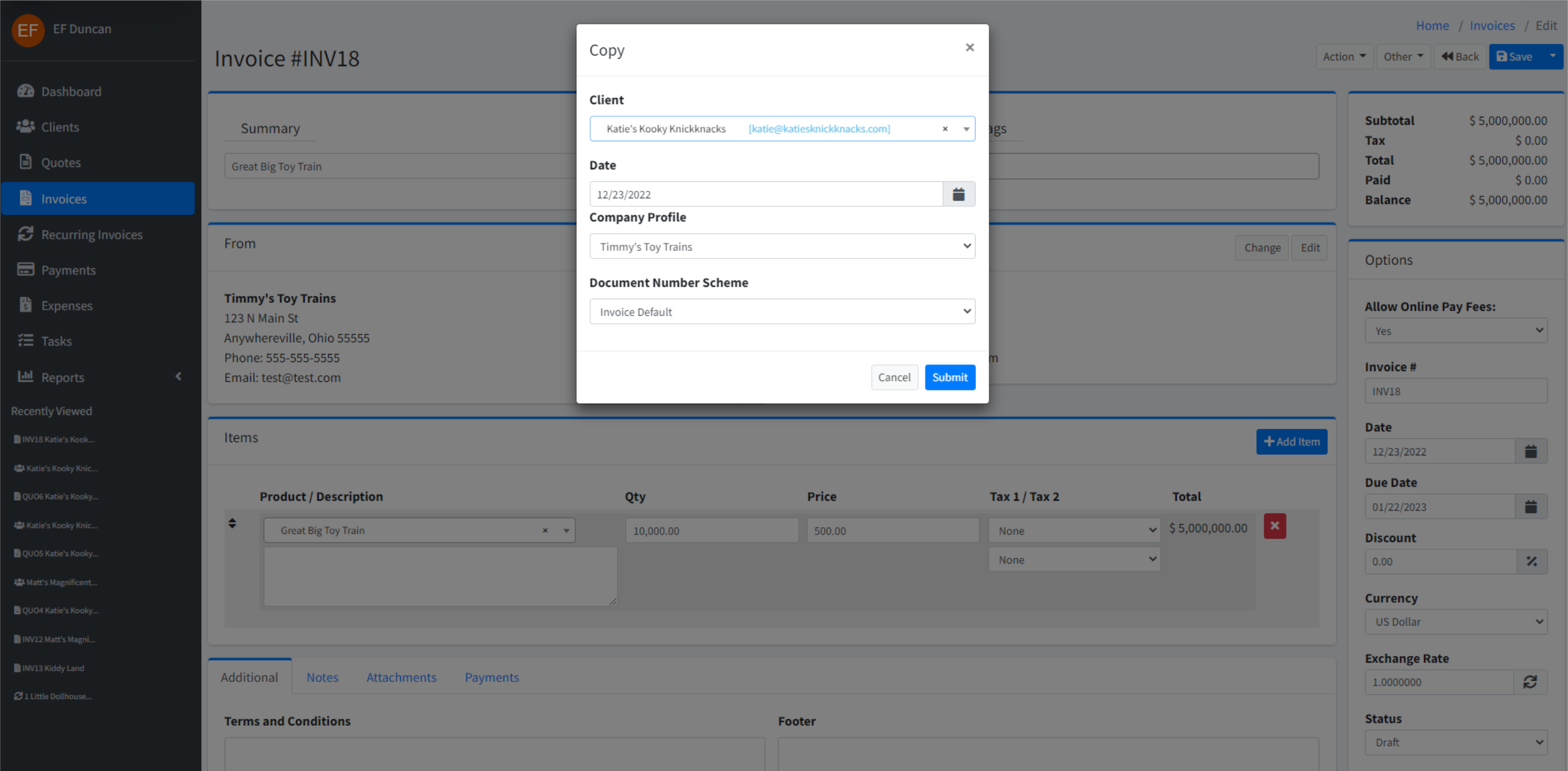 Press Submit when done and you'll be taken to the Invoice Edit screen.