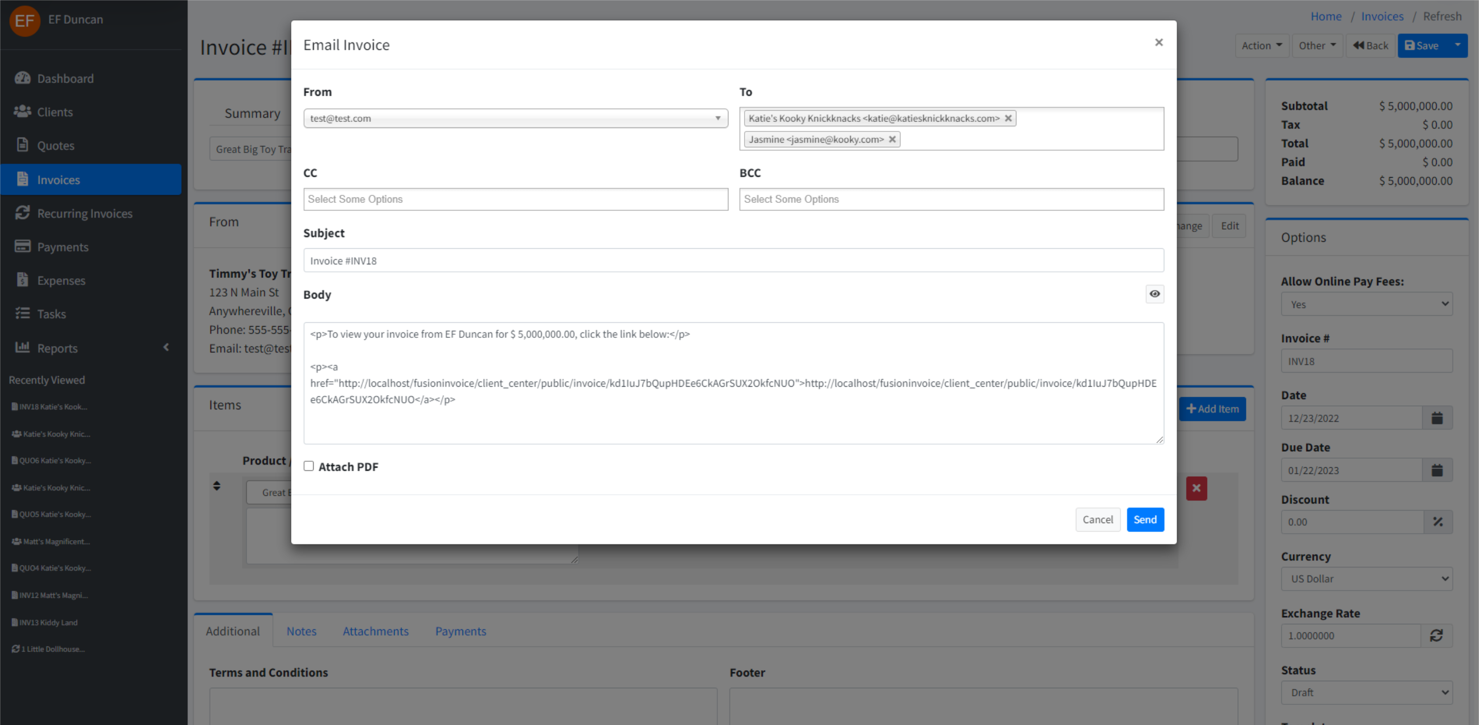 The Email Invoice screen allows you to add additional recipients and change the subject and/or body if necessary.