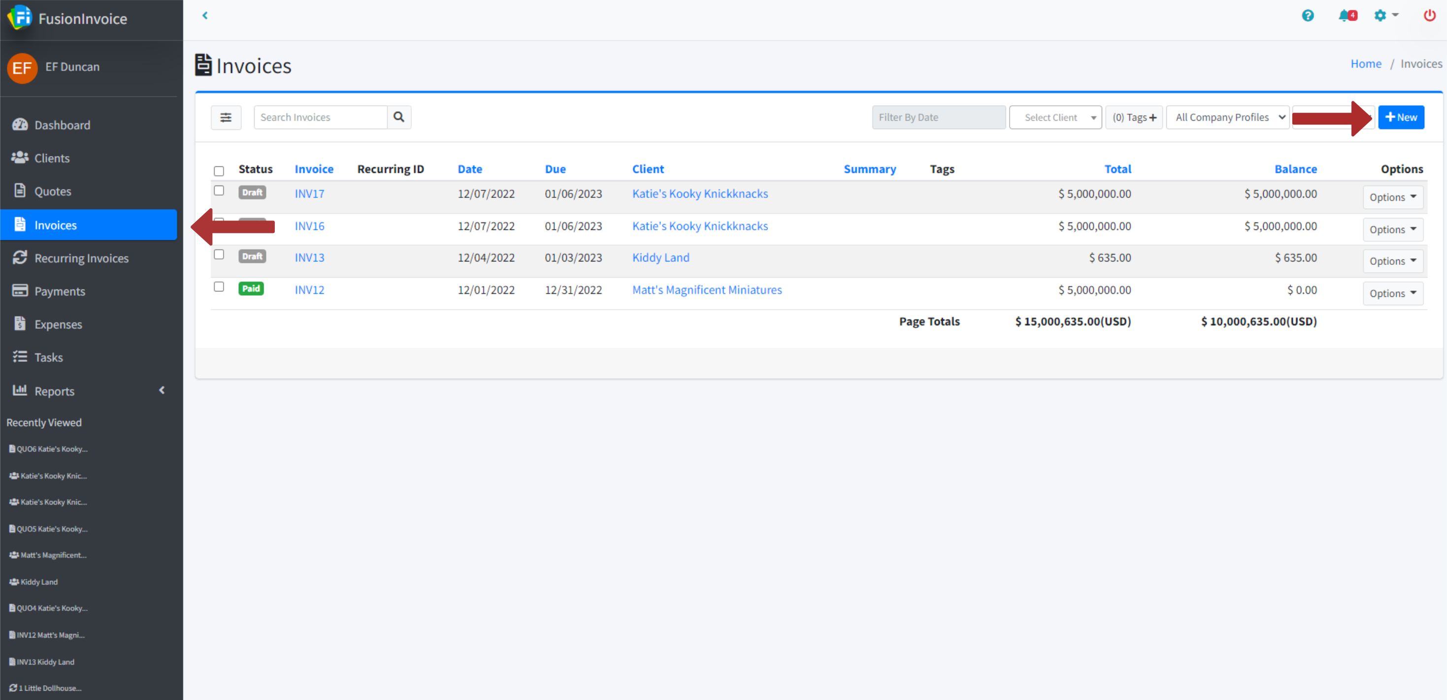 The Invoices list screen is the screen shown when you click on "Invoices" on the navigation menu to the left. It provides a listing off all of your invoices, with search and filter options at the top, allowing you to search for invoices and filter invoices by company profiles and status. The status filter is particularly useful, for example, when you need to know which invoices are overdue, or which are still in a draft phase.