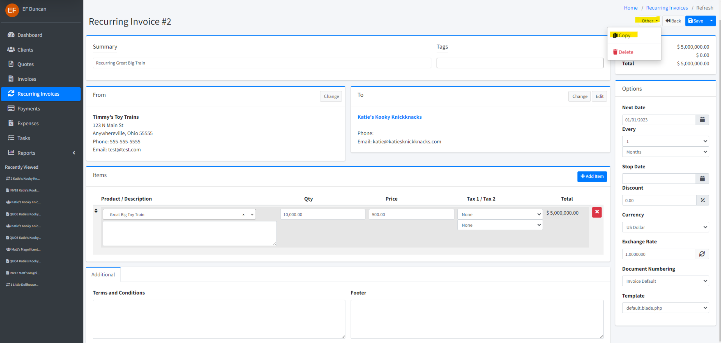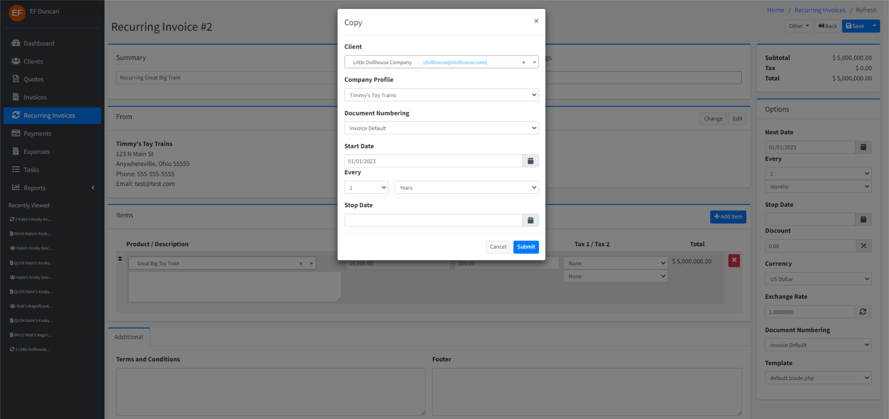 Press Submit when done and you'll be taken to the Recurring Invoice Edit screen.