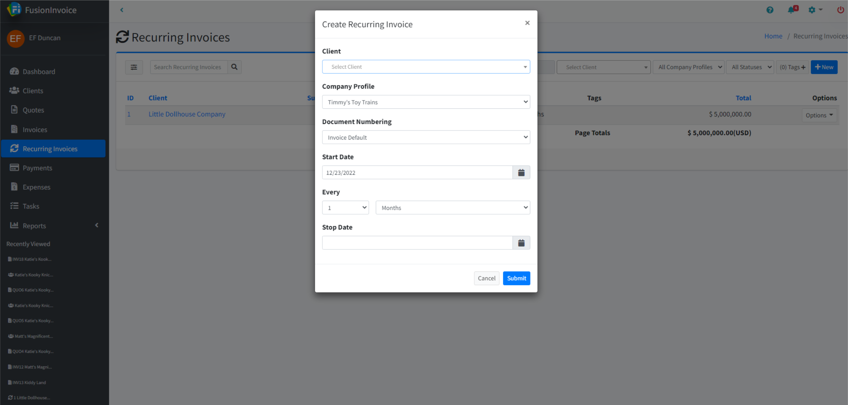 The Create Recurring Invoice screen will prompt you for the Client Name, Company Profile, Document Number Scheme, Start Date, frequency, and a Stop Date if applicable.