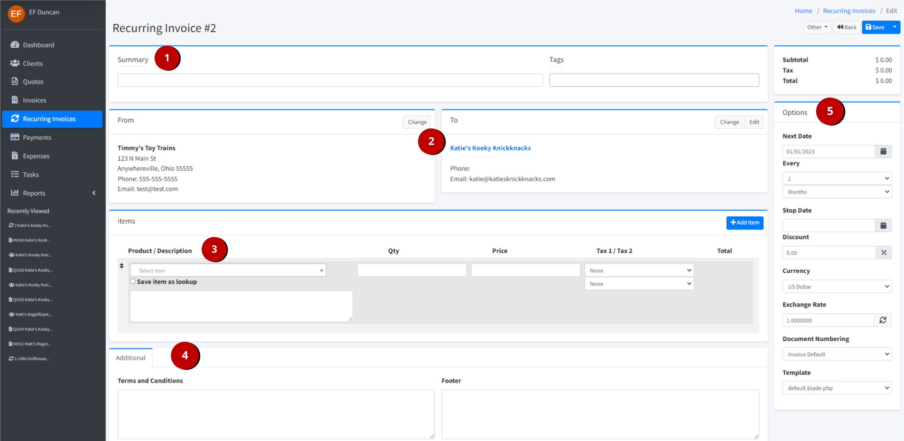 The Recurring Invoice Edit screen is where you'll add line items as well as define further properties and options for your recurring invoice.