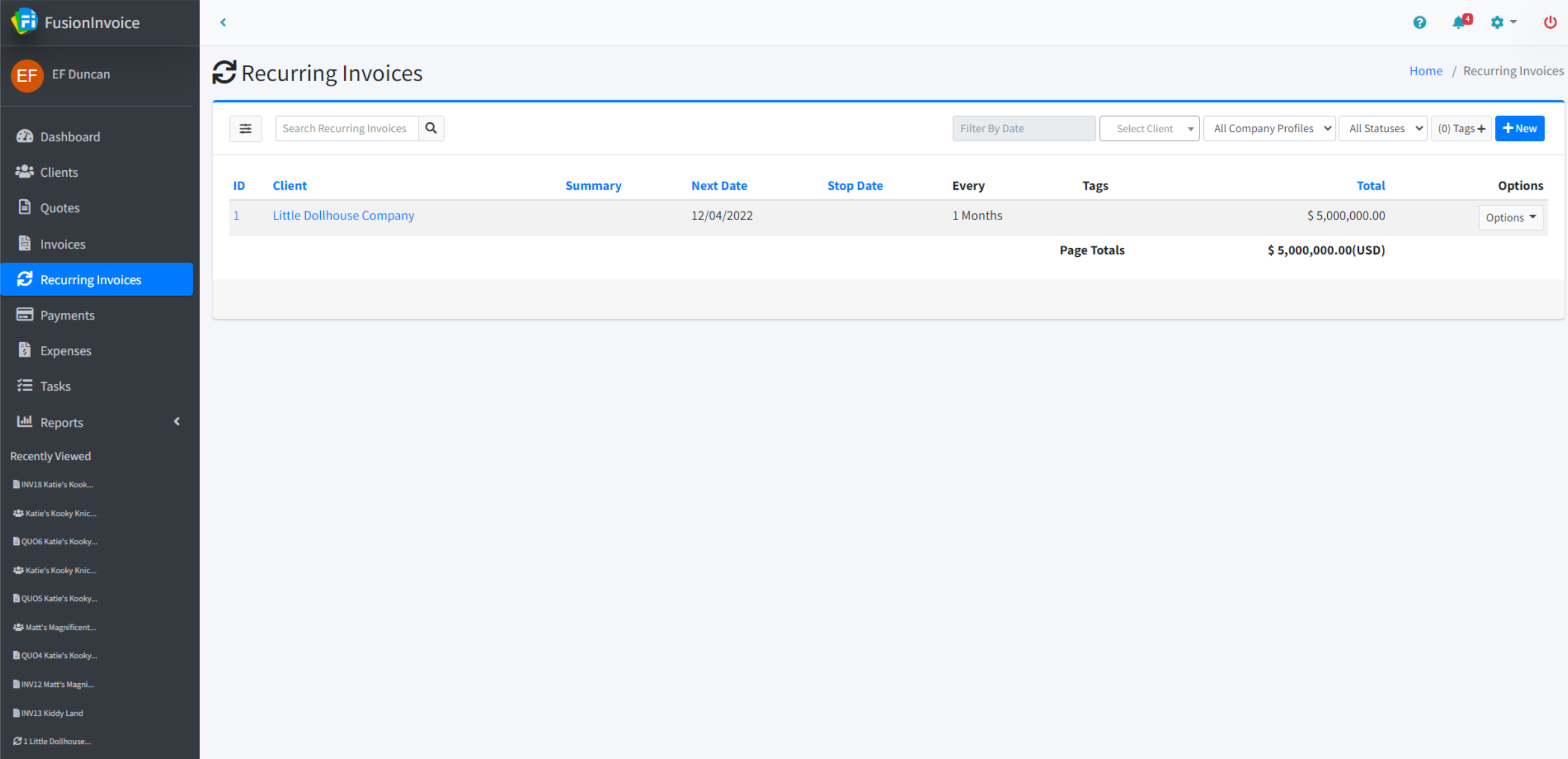 Recurring invoices act as a template for invoices which need to be generated on a specific frequency (once a month, twice a year, etc). Recurring invoices are almost identical to invoices. The difference is that recurring invoices aren't sent directly to a client (the generated invoice is) and payments aren't made to a recurring invoice (payments are made to the generated invoice).