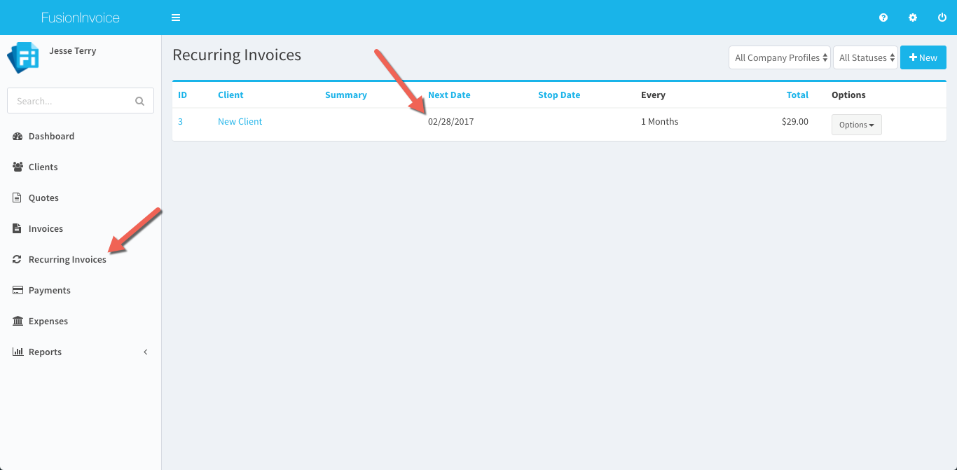 1. You'll be greeted by an empty, white page. This is good - if you go back to check your list of recurring invoices, you should find that the Next Date has incremented to the next date in the set frequency. You should also find that the new invoice has appeared in your list of invoices. If this is the case. then the Task Scheduler cron job hasn't been set up or has been set up improperly.