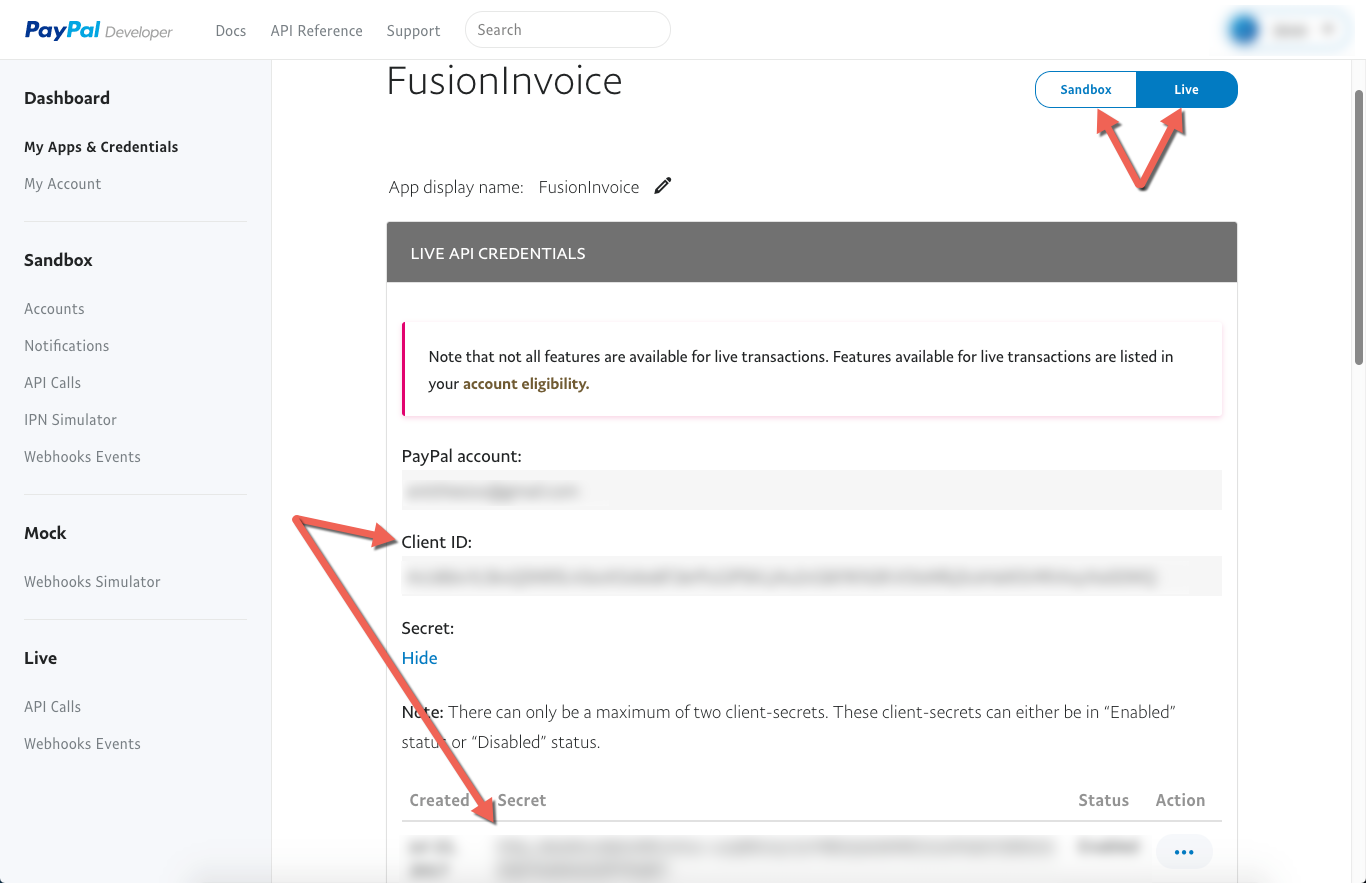 Once the app is created, the Client ID and Secret ID can be obtained. Note there is an option to switch between the keys for Sandbox and Live. Be sure and use Sandbox for testing purposes and Live for production. Also note the Secret ID spans two lines, so be sure the entire key gets copied. Configure the keys in FusionInvoice on the Online Payments tab in System Settings.