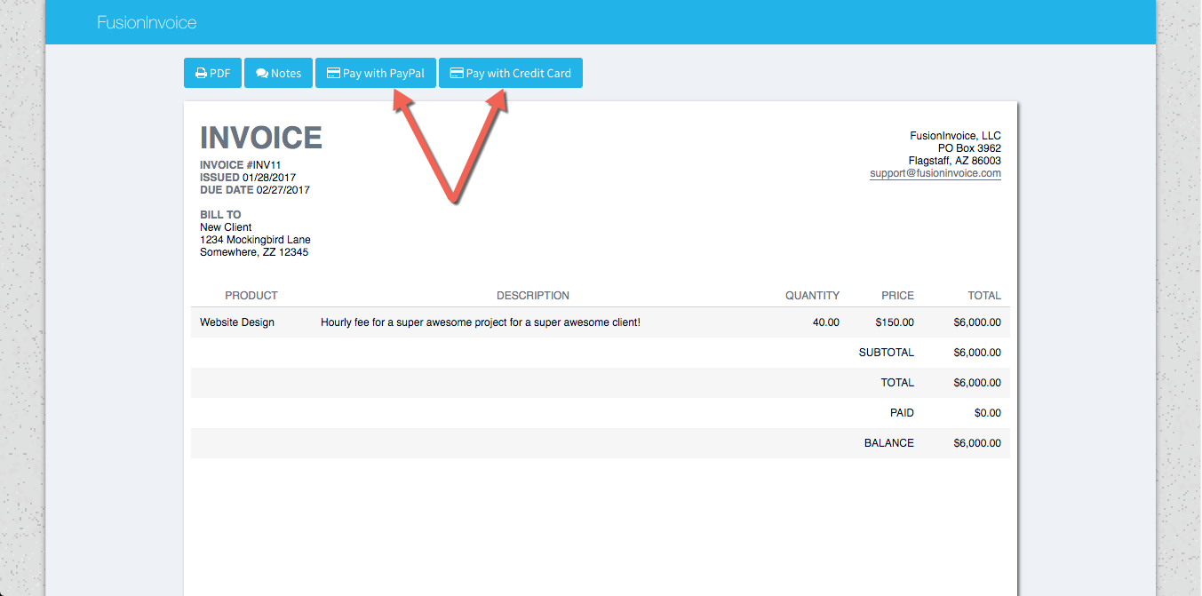 Once you have FusionInvoice configured to accept online payments, clients may pay their invoices using the invoice public link.